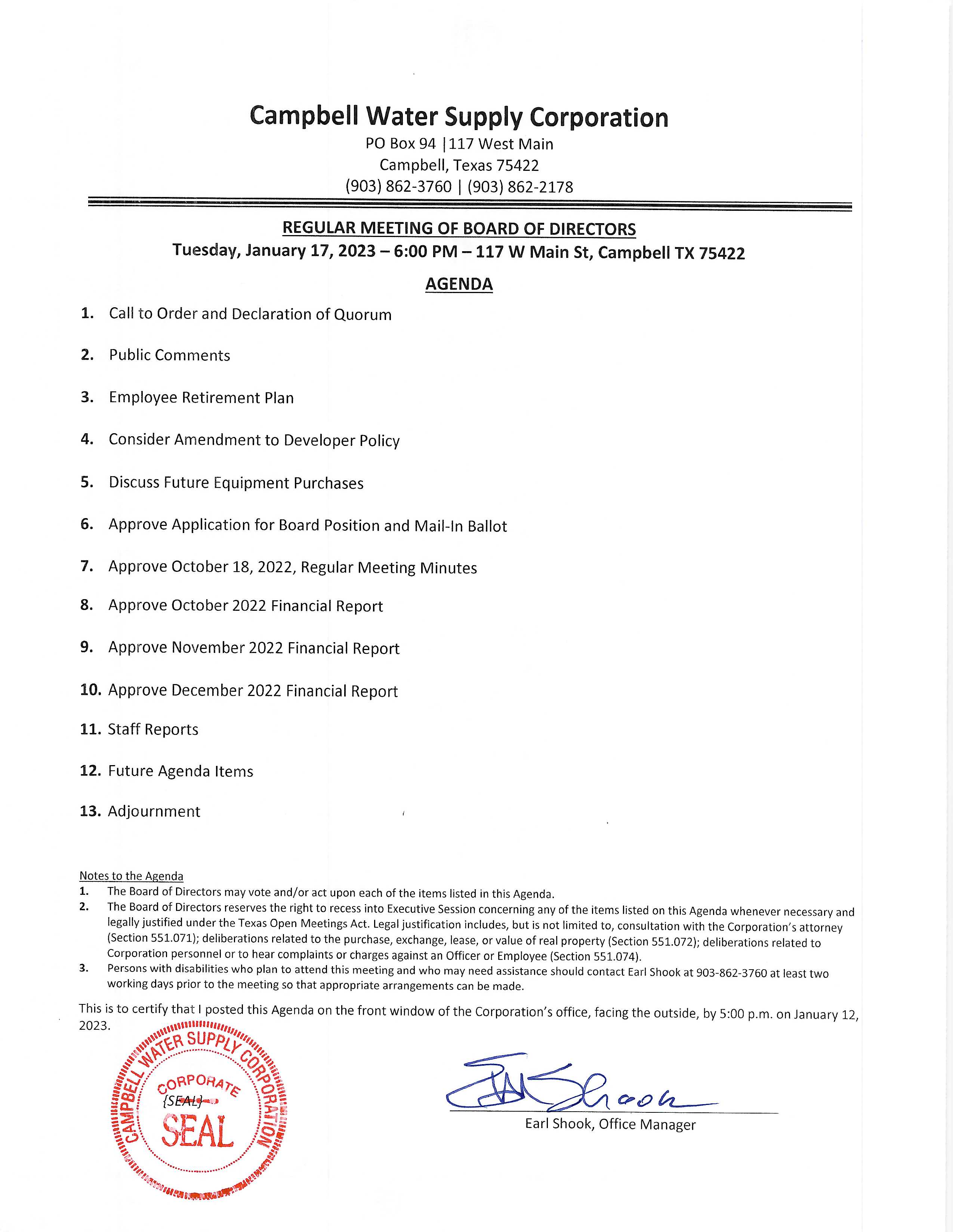 Our meetings are held the 3rd Tuesday of each month at 6:00 PM. Meetings are held at the Campbell Water Supply office at 117 West Main Street. If you have any questions, please contact our office at 903-862-3760. Our office hours are Monday - Friday from 9am to 2pm.